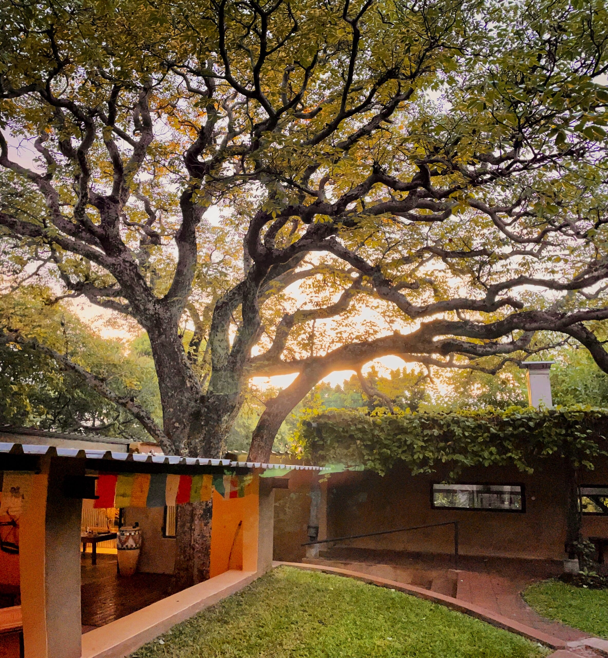 Nothing brings me more into the present moment than moving through a whispering banana plantation, among thigh-high grass, or under an archway of timbers and trusses—our chapel, as I call it—in the Kalahari woodland. Strolling through the tangle that is my regenerative garden, breathing in the scent of the galangal flowers and rosewood blossom. Losing myself as the Paradise Flycatchers construct their eggcup nests, cushioning them with moss oversewn with cobwebs, in the branches of teak trees around our house. Stroking the massive mottled trunk of the wild mongongo tree in the center of our house.